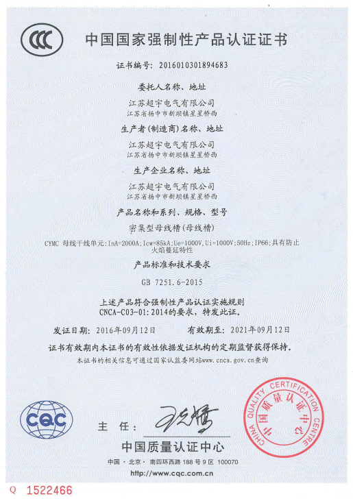 China national compulsory product certification for cymc intensive bus duct