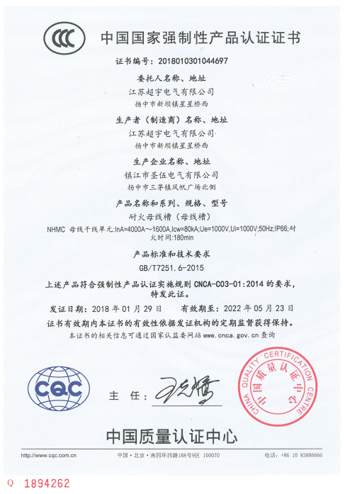CYMC-II compulsory product certification certificate for dense bus duct